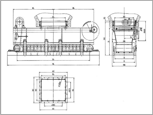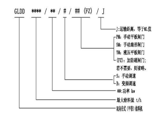 雙向帶式(甲帶)給料機在訂貨時須給出從料倉口中心到卸料口的距離以及給料量和電壓等級等參數(shù),以便進行制作。雙向帶式(甲帶)給料機有兩個出料口,為了實現(xiàn)物料向兩個方向移動并適用于一個料倉,在不同時間分別向兩個承接裝置給料的工況,采用的驅(qū)動裝置的正反轉(zhuǎn)可以帶動甲帶的正反轉(zhuǎn)。